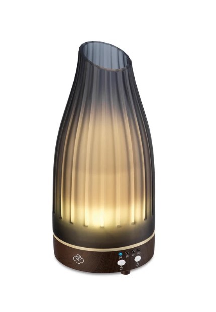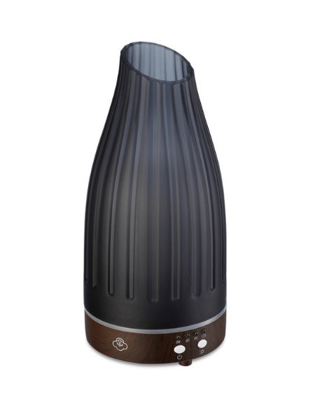Aroomidifuuser Twilight, suitsuhall mattklaasist korpus, 7 pehmet LED valgust, timer, 4/8 tundi tööaeg. Veepaak 90ml, mõõdud 9x19,1cm, kaal 500 g, pakend sisaldab adapterit, garantiikaarti ja kasutusjuhendit.