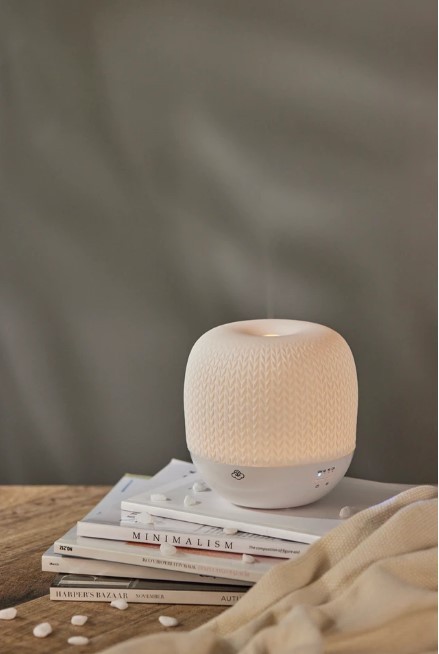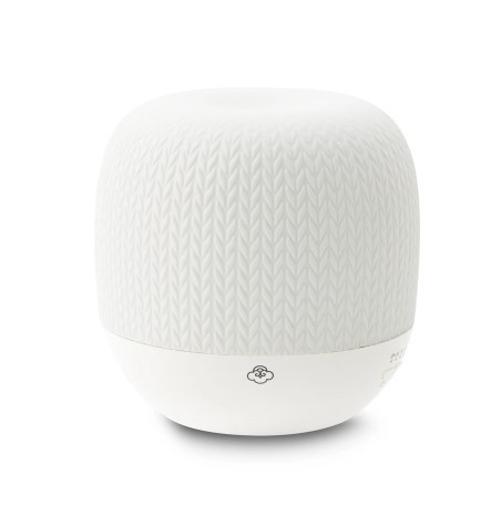 Aroomidifuuser Knit valge, ultrasonic Cool Mist aroomiteraapia difuuser, valge kootud mustriline keraamiline korpus, 7 pehmet LED valgust, timer, 8/16 tundi tööaeg. Veepaak 150ml, mõõdud 14x13,8cm, kaal 500 g, sobib ruumile 10-35m2, pakend sisaldab adapterit, garantiikaarti ja kasutusjuhendit.